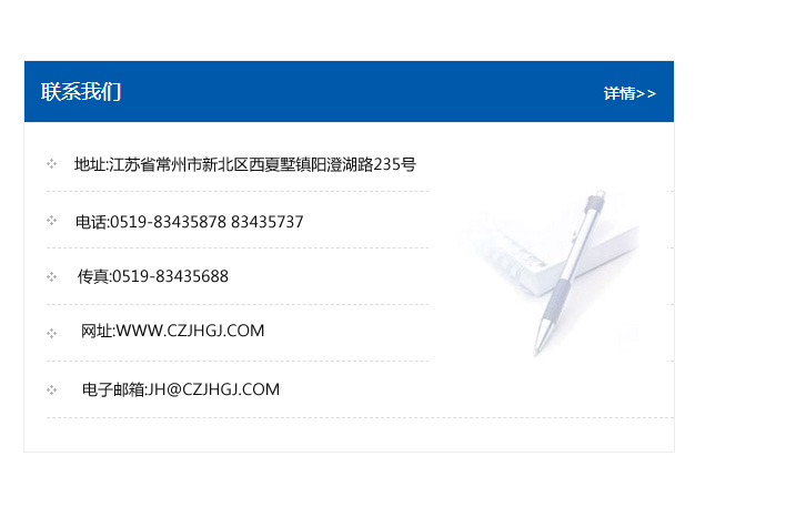傳真:0519-83435688    郵編:213135    網(wǎng)址:WWW.czjhgj_com.n7776.com    電子郵箱:JH@czjhgj_com.n7776.com